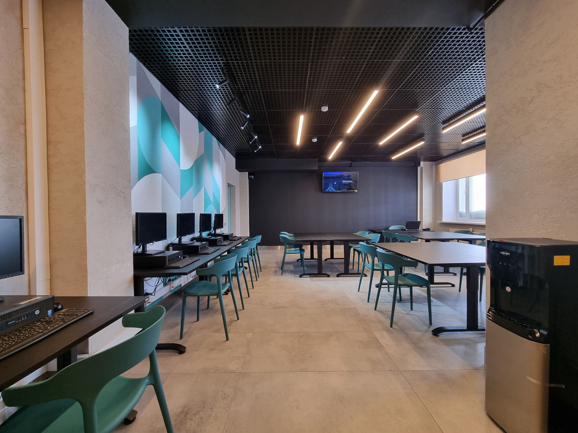 В учебном классе выполнили графический паттерн, в помещении установили плоский телевизор 4K LED, который может использоваться для показа образовательных видеоматериалов или презентаций. Новые современные компьютерные столы, сделанные из прочного материала, имеют эргономичный дизайн, что способствует комфортному обучению. Имеется питьевой кулер с горячей и холодной водой, предусмотрено и достаточное количество электророзеток для зарядки устройств и подключения дополнительной техники.