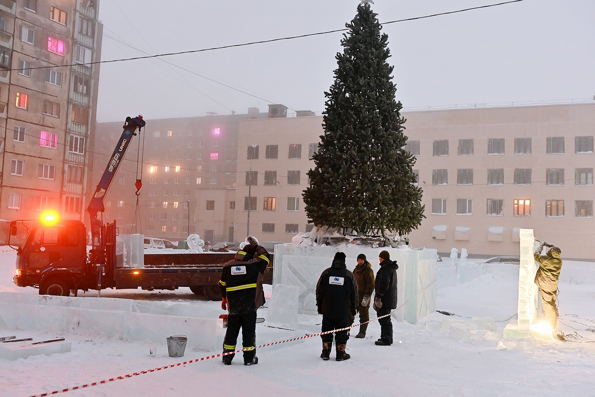 Город готовится к празднованию Нового года с новыми ледяными скульптурами.