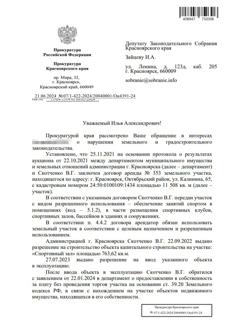 На странную сделку мэрии обратил внимание депутат Заксобрания Илья Зайцев. После его запроса прокуратура организовала проверку и выяснила, что в ноябре 2021 года предприниматель Скотченко В.Г. получил в аренду 11,5 тысячи квадратных метров по адресу улица Калинина, 65. Договор был заключён с департаментом муниципального имущества и земельных отношений администрации Красноярска. Территорию можно было использовать только для обеспечения занятий спортом в помещениях.