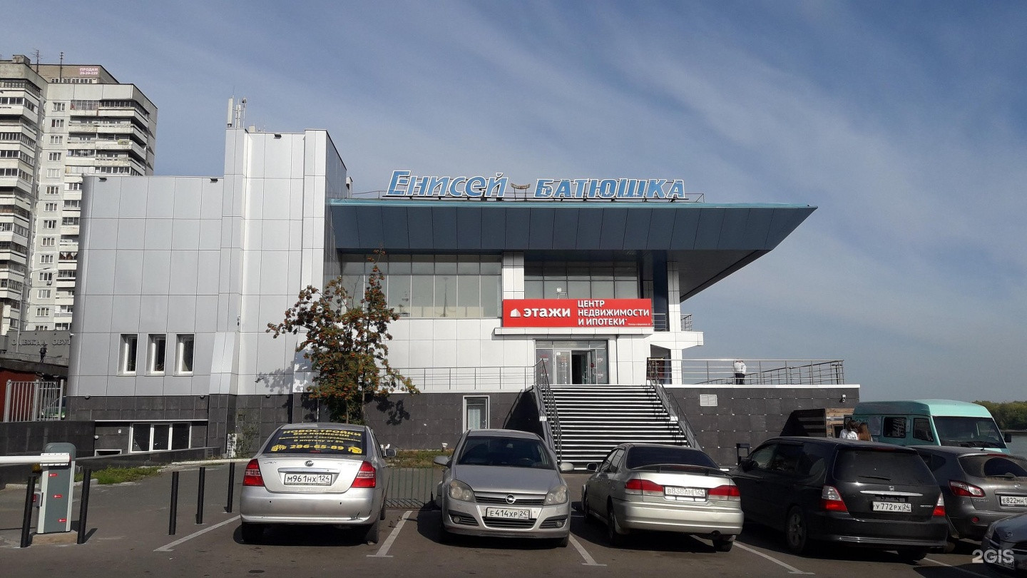 Со здания в настоящее время исчезла вывеска "Енисей Батюшка".