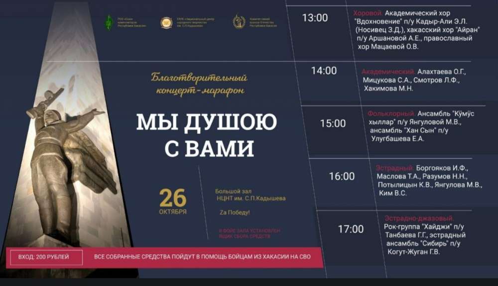 Пресс-служба Министерства культуры Республики Хакасия сообщает, что 26 октября в большом зале Национального центра народного творчества имени С.П. Кадышева в столице Хакасии состоится благотворительный концерт-марафон творчества композиторов Хакасии «Мы душою с вами». Это мероприятие направлено на поддержку земляков-участников СВО.