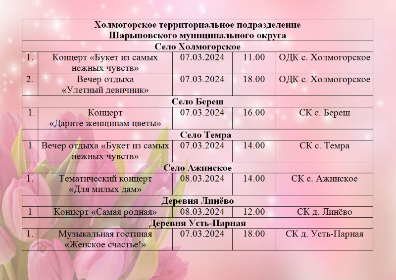 В сёлах и деревнях Шарыповского муниципального округа состоятся концерты, вечера отдыха и развлекательные программы, посвященные Международному женскому дню.