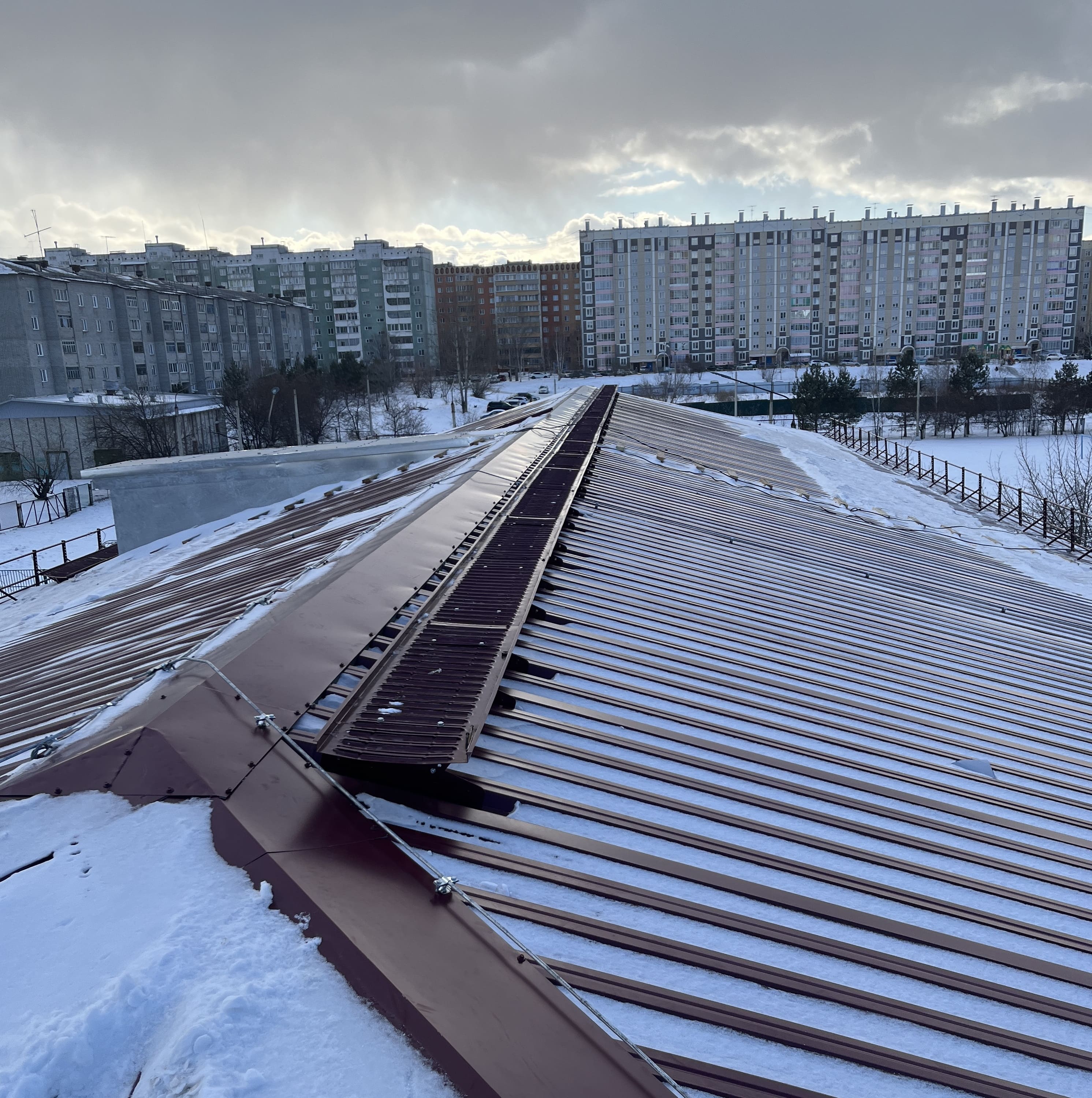 Смонтированы распределительные щиты освещения чердака, система обогрева крыши и молниезащиты здания. Выполнены работы по монтажу наружной водосточной системы, монтаж автоматической противопожарной защиты кровли, пожарных лестниц, деревянные элементы крыши (стропила и обрешетка) обработаны огнезащитным составом.