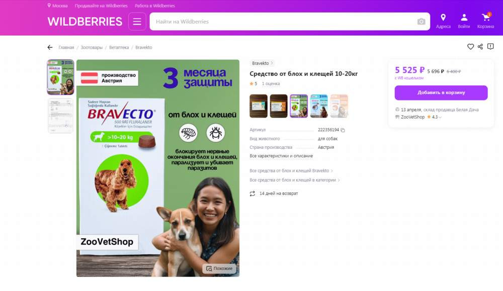 - на двух сайтах предложен к реализации лекарственный препарат «Бравекто», не имеющий на вторичной (потребительской) упаковке наименование лекарственного препарата на русском языке.